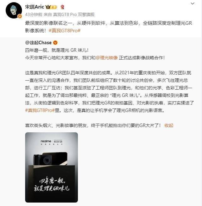 realme市场沟通总监 @宋琪Aric 转发了这条微博,并评论称,“最深度的影像联名之一,从硬件到软件,从算法到色彩,全链路深度定制理光GR影像系统!#线Pro# ”。realme中国区CMO @楚楚_Jessie 则称,“realme 理光GR 影像战略合作 从硬件到软件,全方位深度联调 #线Pro# ,就是理光GR味儿!抬手就出片,记录你想记录的每一个瞬间。”