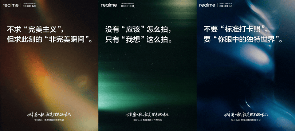 随后,@真我手机 又陆续发布了三张预热海报,并称,“不要‘标准打卡照’,要“你眼中的独特世界”。四年磨一舰,就是理光GR味儿 10月14日,真我 x @理光映像 影像战略合作发布会,共同见证移动影像的越级时刻!”“没有‘应该’怎么拍,只有‘我想’这么拍。”“不求‘完美主义’,但求此刻的‘非完美瞬间’。”