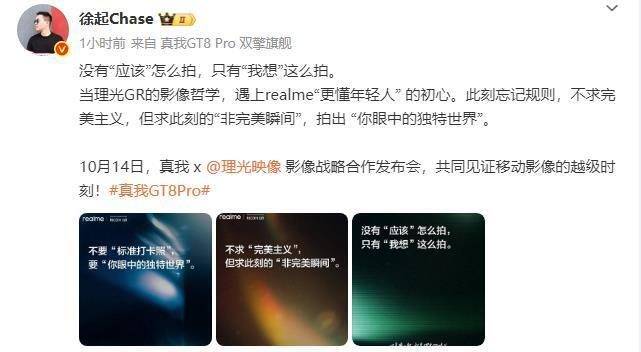 @徐起Chase 和 @楚楚_Jessie 随后分别补充称,“没有‘应该’怎么拍,只有‘我想’这么拍。当理光GR的影像哲学,遇上realme‘更懂年轻人’ 的初心。此刻忘记规则,不求完美主义,但求此刻的‘非完美瞬间’,拍出 “你眼中的独特世界”。”“realme 理光GR 影像战略合作 从硬件到软件,全方位深度联调 #线Pro# ,就是理光GR味儿!抬手就出片,记录你想记录的每一个瞬间。”