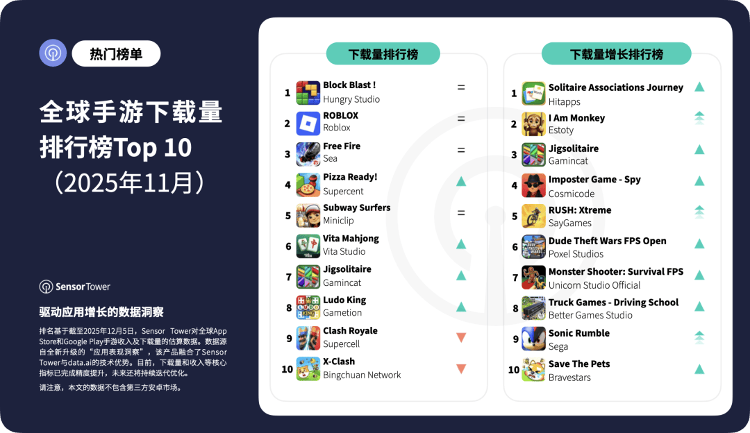 11月下载榜上增长最快的游戏,展示了移动端需求的多元化——从经典的桌面游戏机制,到物理驱动的沙盒玩法,以及IP驱动的派对体验。这充分凸显了易于上手的玩法和强大的品牌认知度,是如何持续推动全球市场实现突破性增长的。返回搜狐,查看更多