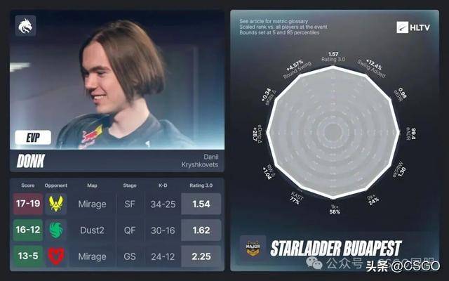 在donk的9张比赛地图中,有7张的rating高于1.40,其中两张超过2.00;整届赛事层面,他交出了1.57的rating、每赢下一回合1.36次击杀(KPRW),以及+4.57%的 Swing,数据表现极具统治力。
