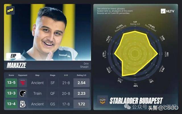 makazze的表现起伏要比榜单中排在他前面的两位队友更大,但凭借两次顶级的淘汰赛发挥,他最终成为NAVI获胜地图中rating最高的选手,rating为1.46。