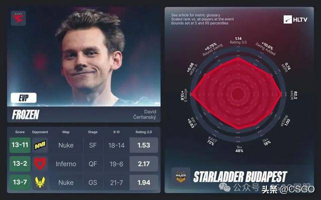 FaZe奇迹般闯入决赛同样团队努力的结果,但frozen无疑是其中最为稳定的一环。他是决赛中唯一rating超过 1.00 的选手,并在赢下的地图中打出了1.36的rating,赛事整体KPRW达到1.01。