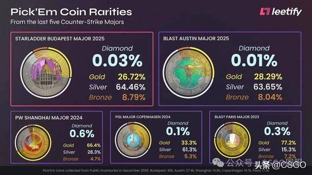 布达佩斯Major钻石币占比0.03%,高于奥斯汀Major的0.01%。但布达佩斯的黄金币占比仅为26.72%,低于奥斯汀的28.29%。