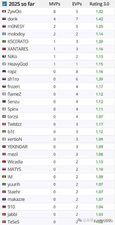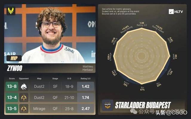 在刚刚结束的赛事中,ZywOo凭借更高的回合胜率超越了ropz,拿下了2025年个人的第8个MVP,并成为自coldzera以来,首位在同一年内两夺Major MVP的选手。
