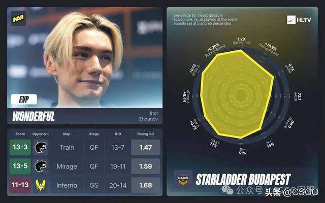 在Train上对阵FURIA打出2.23的rating,这个开局可以说是相当亮眼,尽管他的大部分影响力出现在下半场、当时NAVI已经10-2领先;但真正的带飞,是半决赛对阵FaZe时在Ancient上完成T方单人carry(16-4的K-D、143.2的ADR、3.09的rating)。