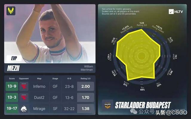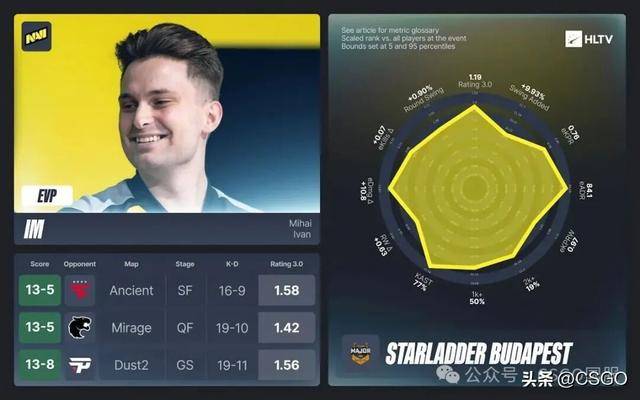 在小组赛阶段,iM以1.26的小组赛rating,获胜地图1.36的rating助力NAVI挺进半决赛。他在淘汰赛中有三张稳定且关键的地图,发挥刚好达标,最终确认了自己的EVP。