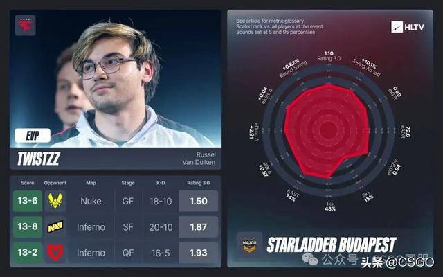 Twistzz在小组赛阶段可以稍微收着打一些——毕竟FaZe出人意料地以整体地图控制能力领跑赛场——但在淘汰赛中,他交出了全队的巅峰表现,也因此拿下一枚EVP。