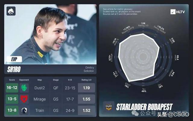 这位罗马尼亚选手经历了角色调整以及队伍整体状态下滑的双重挑战,但他仍然以顶尖大赛1.16的年度rating、Major赛事1.14的rating收官,并在EPL S22与本届布达佩斯Major连续拿下两枚含金量十足的EVP。