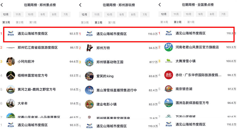 一年来,遇见山海城市度假区凭借卓越体验屡获认可,长期稳居抖音郑州景点榜周榜Top1,多次登顶抖音郑州游玩团购带货周榜Top1,曾跻身抖音全国游玩景区周榜Top1,并在美团、大众点评等平台郑州景点游玩的核心榜单(趣玩榜、收藏榜、成交榜)持续占据TOP2。