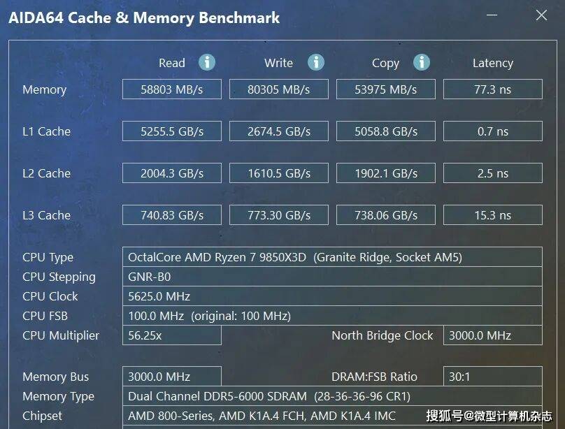 在处理器性能测试开始前,我们首先需要确保主板能完全发挥内存性能,才能更好地释放处理器的性能。因此我们在测试中搭配了一对高性能DDR5 6000 CL28 32GB内存套装,但是如果主板自身没有对内存延迟进行优化的功能,那么即便采用默认延迟设置为28-36-36-96的DDR5 6000内存也不会带来太好的内存性能。比如我们在一款没有内存延迟优化功能的X870E主板上搭配锐龙7 9850X3D处理器、DDR5 6000 CL28 32GB内存套装进行测试,其AIDA64内存读写、复制带宽分别为58803MB/s、80305MB/s与53975MB/s,内存延迟则高达77.3ns。