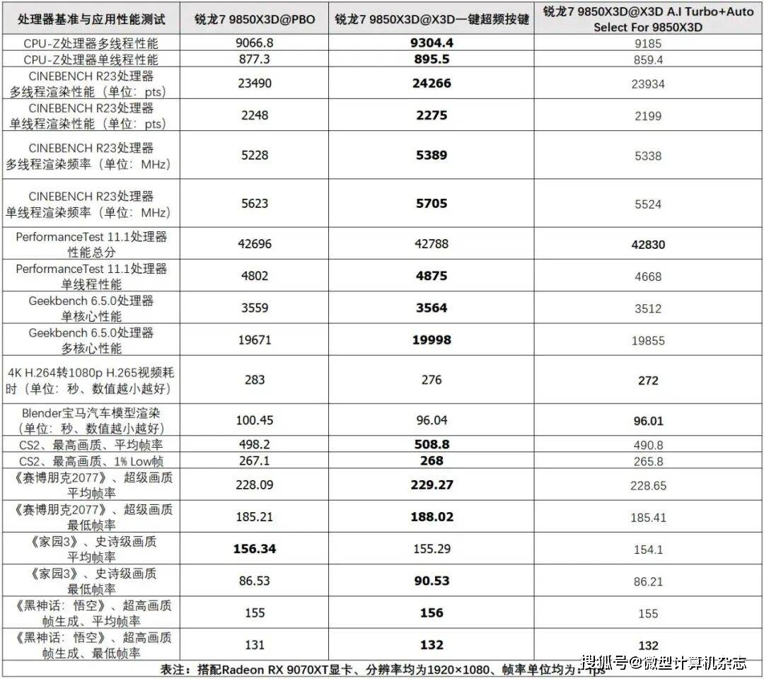 而在使用X3D一键超频按键、X3D AI Turbo自动优化功能后,七彩虹iGame X870E火神主板还能让锐龙7 9850X3D的性能再上一个台阶。其中X3D AI Turbo自动优化功能可以有效提升处理器的多核心计算性能,不论是4K H.264视频转1080p H.265视频,还是Blender宝马汽车模型渲染,在开启X3D AI Turbo自动优化后,都能在三个模式中获得最低的耗时。举例来说,它的视频转码耗时比普通PBO模式下少了11秒,Blender宝马汽车模型渲染耗时也少了4秒,可以有效减少用户的等待时间,带来更高的工作效率。如果使用X3D一键超频按键,锐龙7 9850X3D则能带来优秀的处理器基准性能测试成绩,在CPU-Z处理器性能测试、CINEBENCH R23与Geekbench 6.5.0处理器性能测试中,都有最好的表现。同时在游戏《赛博朋克2077》《黑神话:悟空》的平均帧率、最低帧率,CS2的平均帧率、1% Low帧,以及《家园3》的最低帧率中也要更高一些。