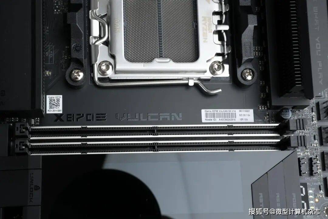 该设计的缺失就是少了两根内存插槽后,内存容量扩展能力下降。不过从实际现状来看,这不是一个大问题,因为现在内存价格暴涨,大部分用户最多只会使用两根内存,部分用户装机时甚至可能只会购买一根内存,采用单通道配置。而且iGame X870E火神主板单根内存插槽最大支持64GB内存容量,总计支持128GB内存容量,完全可以满足普通用户未来的内存容量扩展需求,所以倒不如提升主板支持高速率内存的能力更实用。