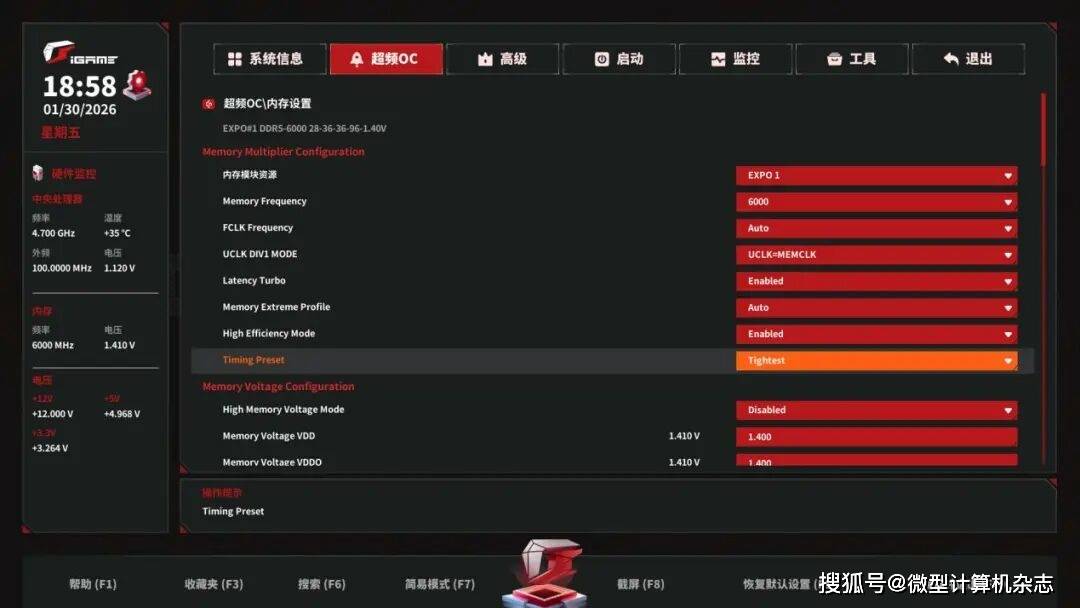 而七彩虹iGame X870E火神主板BIOS中则拥有两大内存性能优化黑科技——Latency Turbo(降低延迟)与High Efficiency Mode(高效能模式)两个选项。开启这两种模式后可以进一步提升内存的传输带宽、降低延迟。需要说明的是High Efficiency Mode拥有“Relax”(宽松)“Balance”(平衡)“Tighter”(较紧)“Tightest”(最紧)4个选项,“Tightest”可以提供最好的性能,其他选项依次降低。值得注意的是,开启High Efficiency Mode后,BIOS会弹出可能有不稳定现象的警告出现,如果用户遇到这类情况,降低效能等级或关闭高效能模式即可。