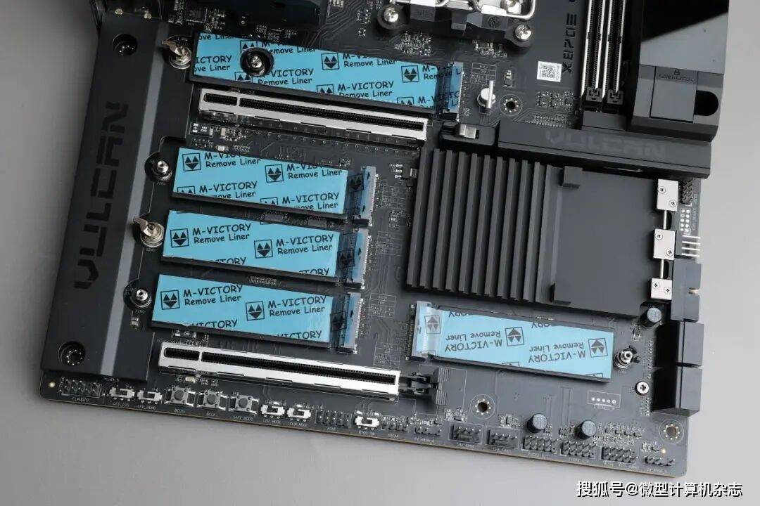 同时5个M.2 SSD插槽都拥有便捷卡扣设计,无须螺丝,用户只要旋转卡扣就能固定或拆下SSD,非常方便。考虑到SSD发热量大,所以这款主板还为5个SSD接口配备了大面积一体式M.2 SSD散热装甲,而且M.2 SSD散热装甲也采用快易拆设计,用户只需扳动旋钮即可取下或安装散热装甲,非常方便。值得称赞的是,无论是SSD插槽的安装底板,还是M.2 SSD散热装甲都铺设了高导热硅胶片,让SSD正反两面的高发热元器件都能与散热片紧密接触,并将热量快速地传导到散热器上,由机箱内部的散热气流高效带走。