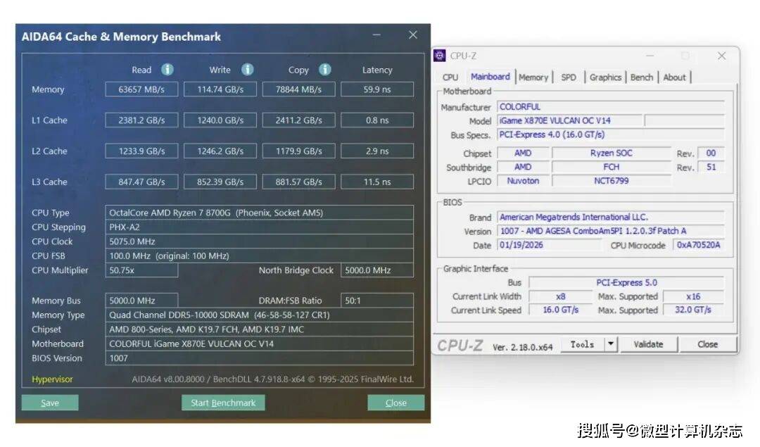 而当我们将处理器更换为拥有优秀内存控制器的锐龙7 8700G时,七彩虹iGame X870E火神主板则能发挥出其双内存插槽的设计优势,在延迟设置为46-58-58-127,1.5V内存电压下,将这对DDR5 6000 CL28 32GB内存套装超频到DDR5 10000。其内存写入、复制带宽获得不小的提升,分别达到114.74GB/s、78844MB/s,内存延迟则降低至59.9ns。这证明七彩虹主板也具备将内存速率超上5位数的能力,而且是在内存仅使用散热片进行被动散热,处理器仅使用水冷散热器的日常环境下就能实现。5位数的内存速率不再只属于需要液氮、职业超频选手的顶级配置,七彩虹主板就能让普通用户体验极限超频的魅力。