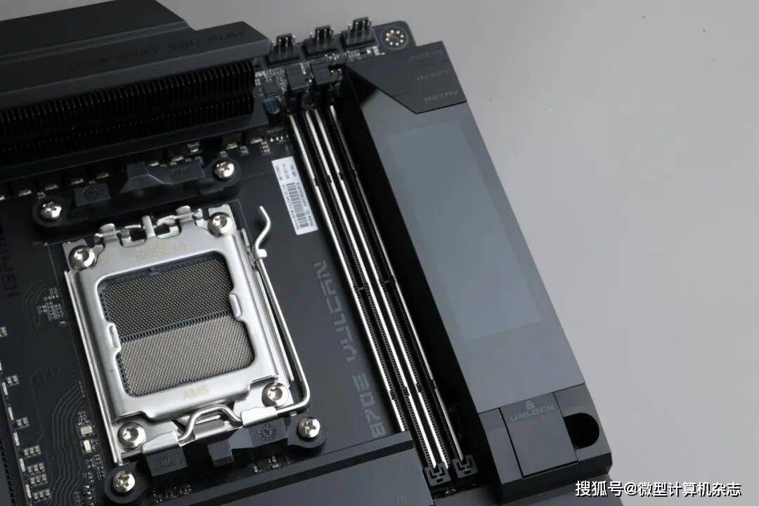 ▲主板虽只配备了两根内存插槽,但其标称最高内存支持速率可达DDR5 10000以上,并采用了金属加固设计。