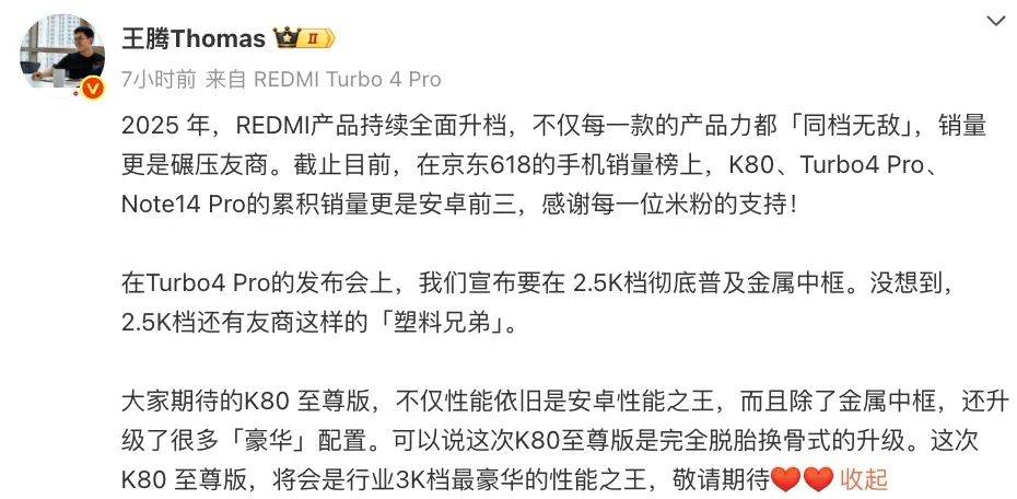 此外,REDMI 后续的手机新品迭代也备受关注。小米中国区市场部总经理、REDMI品牌总经理王腾在预热视频中介绍称,“REDMI K80至尊版绝对是3K档最豪华性能之王”。